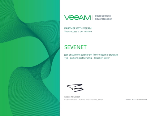 Z przyjemnością informujemy, że jako Sevenet S.A. spełniliśmy wszystkie kryteria pozwalające na uzyskanie partnerstwa Veeam na poziomie Silver. Poziom partnerstwa definiowany jest poprzez zdobyte szkolenia i certyfikaty oraz odpowiedni poziom sprzedaży.